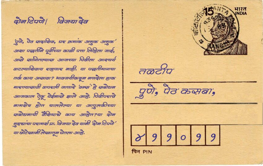 ‘पुणे, पेठ सदाशिव, घर क्रमांक अमुक अमुक’ अशा पद्धतीने पूर्वीच्या काळी पत्ता लिहिला जाई, असे सांगितल्यास आजच्या पिढीला आश्चर्य वाटल्याशिवाय राहणार नाही. या पद्धतीमागचा तर्क काय असावा?…भावजयीकडून नणंदेला हाक मारण्यासाठी वापरले जाणारे ‘वन्सं’ हे संबोधन आजकाल ऐकू येईनासे झाले आहे. पिढीपरत्वे नामशेष होत चाललेल्या या आपुलकीच्या संबोधनाची वैशिष्ट्ये काय आहेत?…या दोन मुद्द्यांचा परामर्श प्रा. विजया…